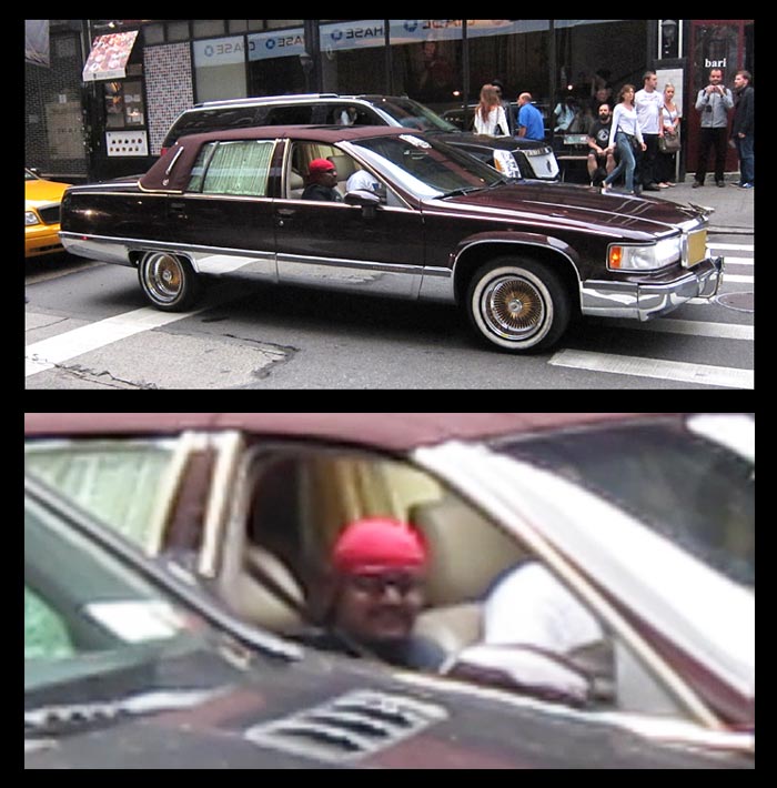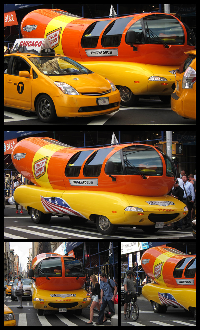 Recently, while crossing Broadway at Spring Street, I had my first sighting of the Oscar Meyer Wienermobile. It was Friday afternoon, and traffic was snarled and slow-moving, as it typically is during rush hour, so I was afforded a few moments time to reach for my camera and record the rare event. Unbeknownst to me at the time, the Wienermobile was making a week-long tour of New York City with special events planned. It was quite a spectacle to see the bright yellow vehicle cruising New York City streets, often surrounded by a sea of yellow taxis. It was stunning to see such a large, immaculate virtual shrine to one of the favorite foods of my youth and the Morin girl – Di Hut Doig 🙂