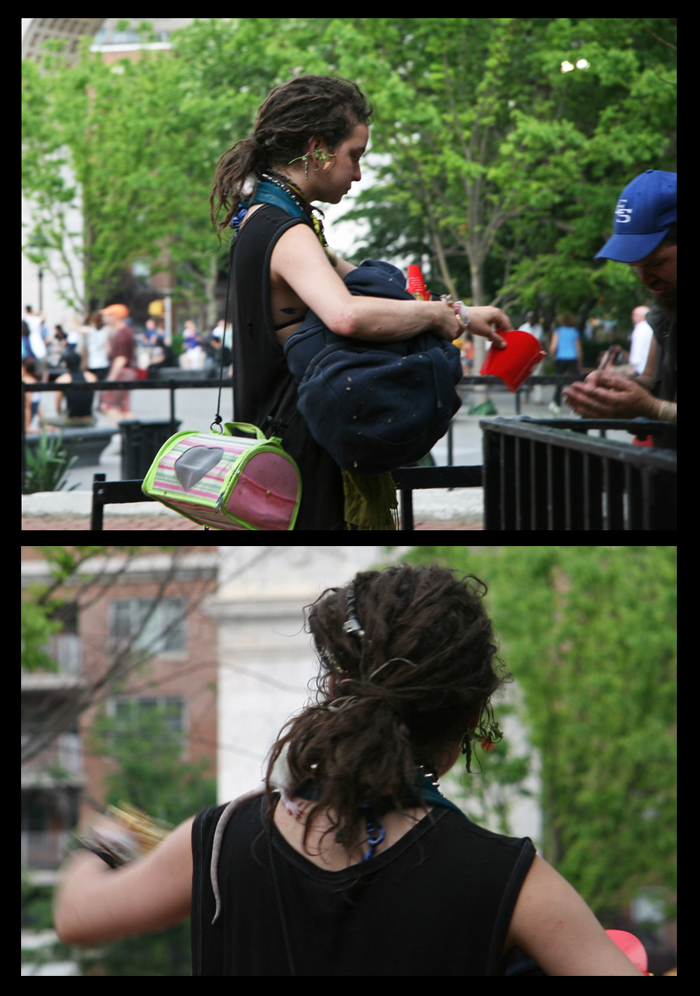 What is more unsettling than contact with a crustie? How about a crustie wearing a pet rat? (If you are not familiar with crusties, see my previous posting here). Take a close look at the photo, and you will see that this girl is sporting a white rat under her hair on the back of her neck. A crustie’s dreadlocks typically goes unwashed, so I imagine her hair provides not only a secluded spot for her companion but also a nesting ground for a variety of flora, fauna, and other edibles.