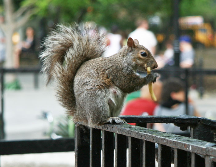 I thought I had a very special photo opportunity when I caught this squirrel enjoying a french fry. Upon reflection, however, it occurred to me that this my observation might not be a particularly unique phenomenon, New York City or otherwise. A little searching turned up other photos on Flickr and videos on YouTube.