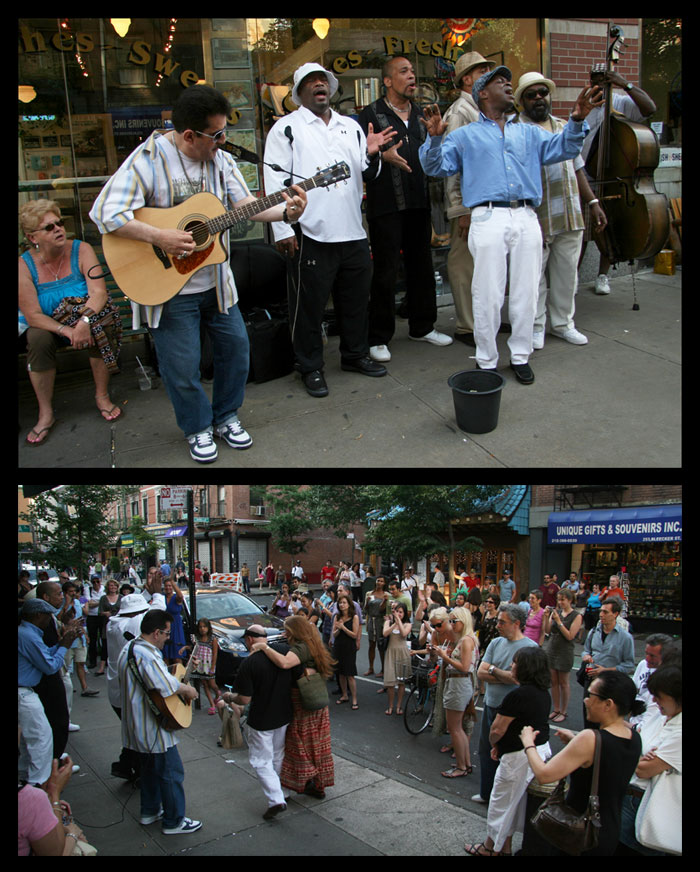 The group of singers in today’s photo, calling themselves Select Blendz, was performing on Bleecker Street, accompanied by one acoustic guitarist. The songs were primarily 50s, 60s, doo-wop, and soul – all classics immediately recognized by the audience. Little encouragement was needed for any type of audience participation, whether rhythmic clapping or singing choruses. The crowd flowed off the sidewalk into the heavily trafficked thoroughfare. The vibe was absolutely infectious, and there literally was dancing in the street.