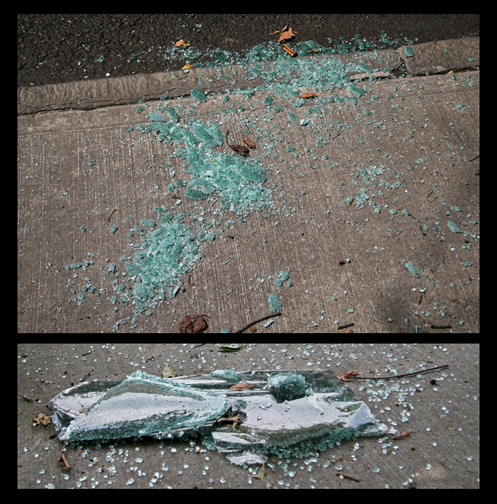 In the outer boroughs, auto break-ins with sidewalks of broken glass is still a common occurrence, as I learned on Sunday, walking down Southern Boulevard near the entrance to the Bronx Zoo. I was surprised to see this on such a major thoroughfare along the zoo property. Not just one, but a chain of broken windows, like islands and islets in an urban coral atoll…