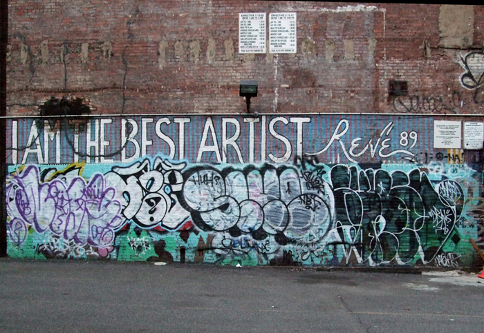 I was startled recently when I came across this mural in a SoHo parking lot. I had never seen it in its entirety – it is typically occluded by any number of vehicles. On this walk, however, it was very early in the morning before opening, and so I was rewarded with a unique, unobstructed view of the entire mural. Seeing this reminded me of how the murals, I Am the Best Artist by René, were everywhere in the 1980s & 90s in SoHo.