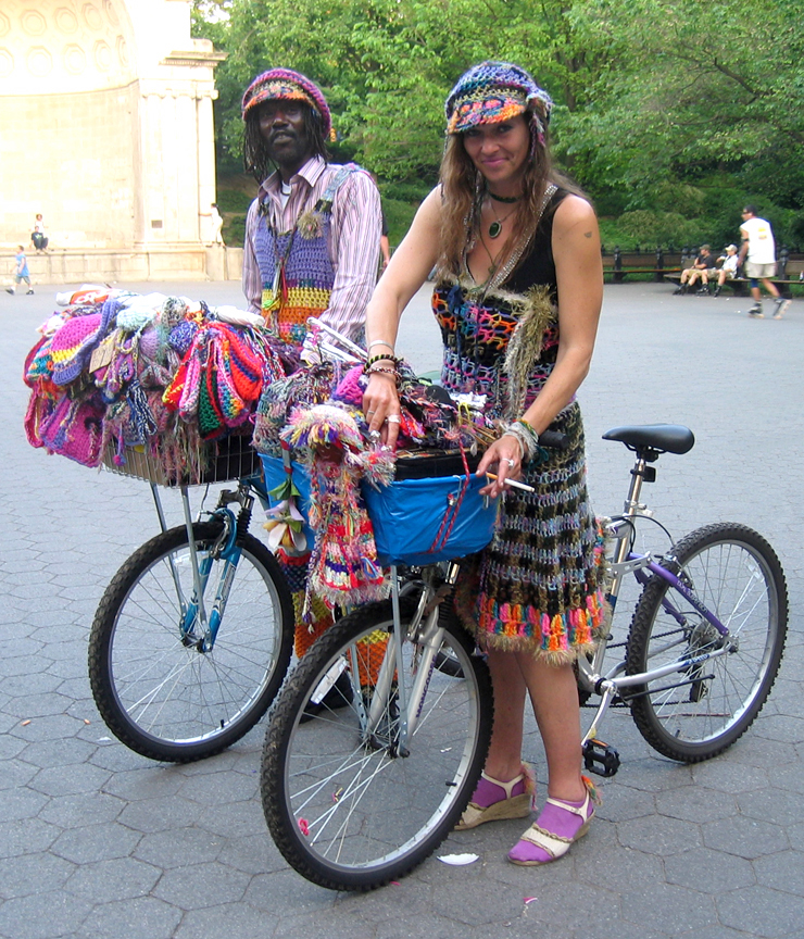 In Central Park, near the Bandshell, I met this colorfully dressed couple who appeared to be selling extremely colorful knitted items. They gave new meaning to the phrase “people of color.” They reminded me of Adam Purple and his girlfriend from the early ’70s who rode around on their purple bicycles all dressed in purple and became known as the “Purple People” (if you are not familiar with Adam Purple and his Garden of Eden, see this New York Times article here and this article and photo gallery here).