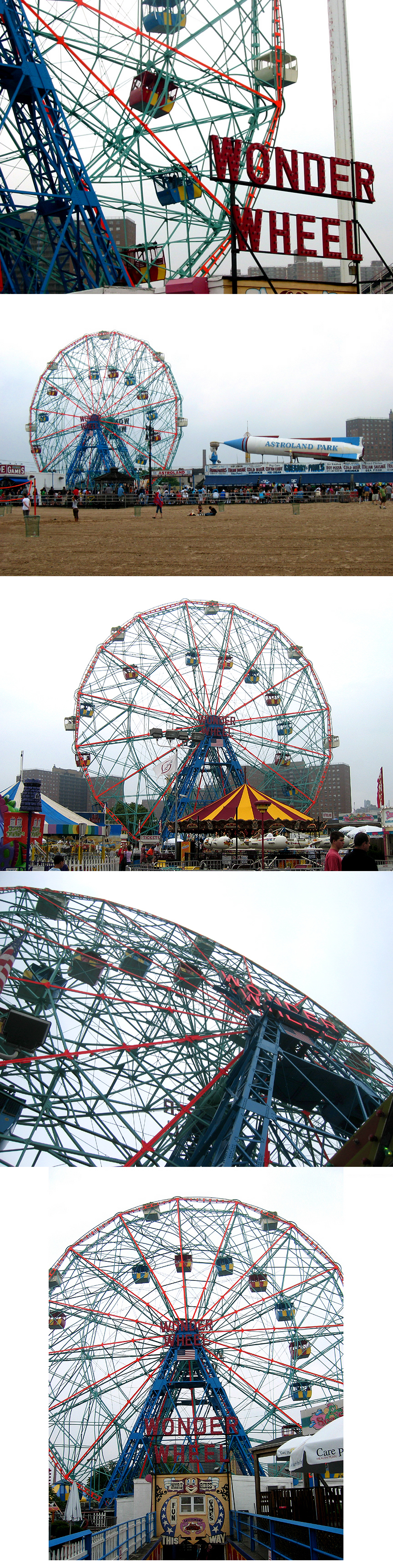 I love Ferris wheels. Although few of the original rides in Coney Island remain or operate, the Wonder Wheel is one which is still going strong and with a perfect safety record. Built in 1920 from Bethlehem steel forged on site, it stands at 150 feet tall, and it is unique with outer fixed cars and inner cars which swing.