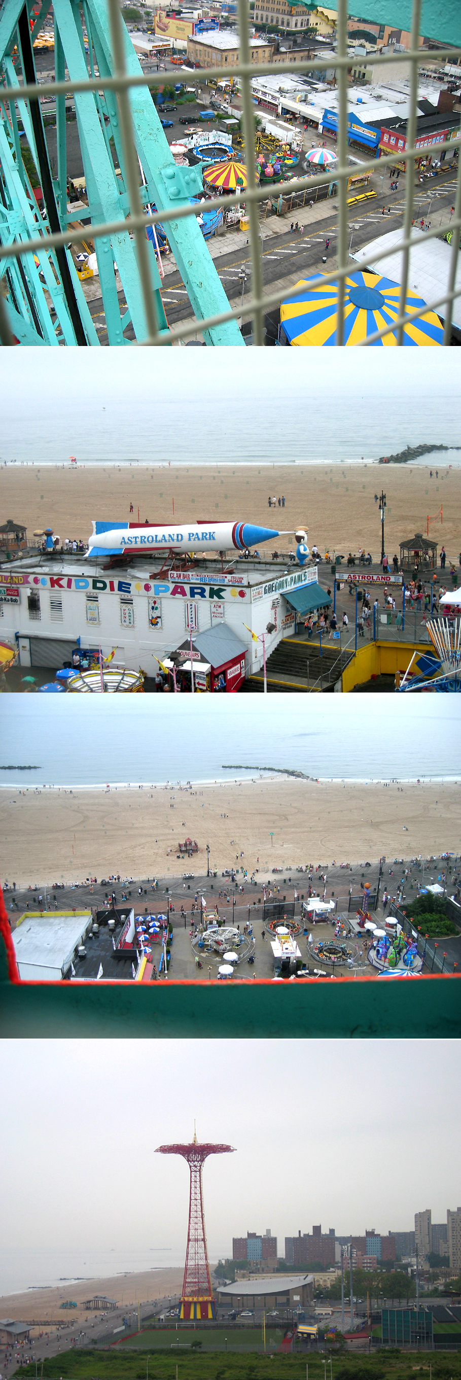 We took a ride – a first for both of us. The views were wonderful, and I took many photos while aloft here and more photos here. The Wonder Wheel was landmarked by the city in 1989. It’s a beautiful antique when viewed from any angle – the beach, the air…