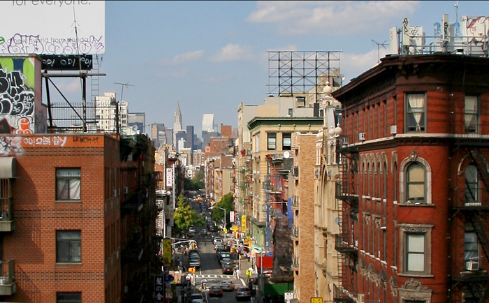 Somewhere in all of this, there will be a glorious accident of perfect alignment. So it is with the vista from the western end of the Manhattan Bridge looking north, straight up this narrow one-way street, where you have a classic New York City juxtaposition: an unobstructed view of the Chrysler and Citicorp Buildings, framed by rooftop graffiti and the jingle jangle of the Lower East Side with a spattering of Chinatown. But the question for me has always has been, which street is that, so conveniently aligned?