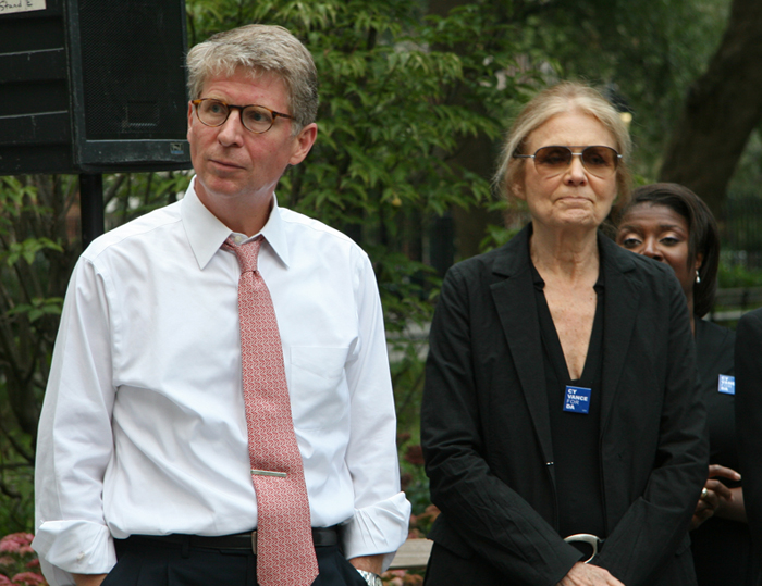 I don’t typically attend political rallies, but occasionally, when they are in my backyard, I do. Yesterday, I was tipped off by a friend that there was to be a women’s rally supporting the candidate for the Manhattan District Attorney, Cyrus Vance. Scheduled to appear were several luminaries, including feminist/writer Gloria Steinem (seen in the photo) and Caroline Kennedy (who was unable to make it). Steinem’s endorsement was seen as particularly strong, owing that one of Vance’s opponents is a woman, Leslie Crocker Snyder.