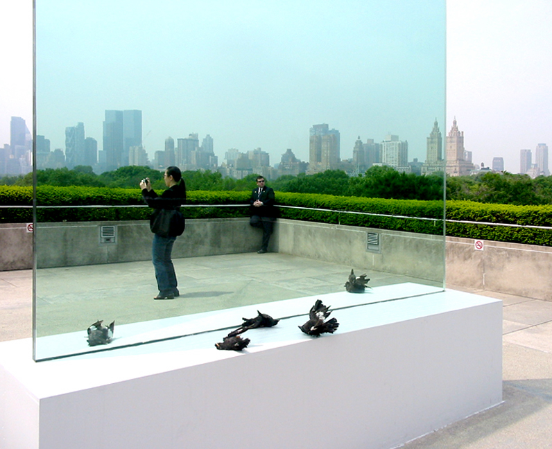 The Metropolitan Museum rooftop gallery is showcasing the work of one artist, Cai Quo Qiang, whom we have posted about before (Move Along, Nothing to See Here), but he has more than one work exhibited. This piece, Transparent Monument, is a giant sheet of glass, at the base of which lie a number of exact replicas of dead birds. The implication is that they didn’t see the glass, were stopped dead, and slid down to the base. They appear to be either starlings or small crows. The birds seem like unfortunate victims of circumstance, killed while going about their business, by the intervention of some inexplicably placed man-made material, as so often happens in “real life”. [Another piece of his occurs every day at noon, when one of the guards fires a special gun which shoots a cloud of black smoke into the sky that slowly dissipates at a rate determined by the atmospheric conditions. It gives a very ephemeral feeling to the whole concept of watching whatever happens before you in life.]