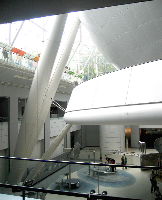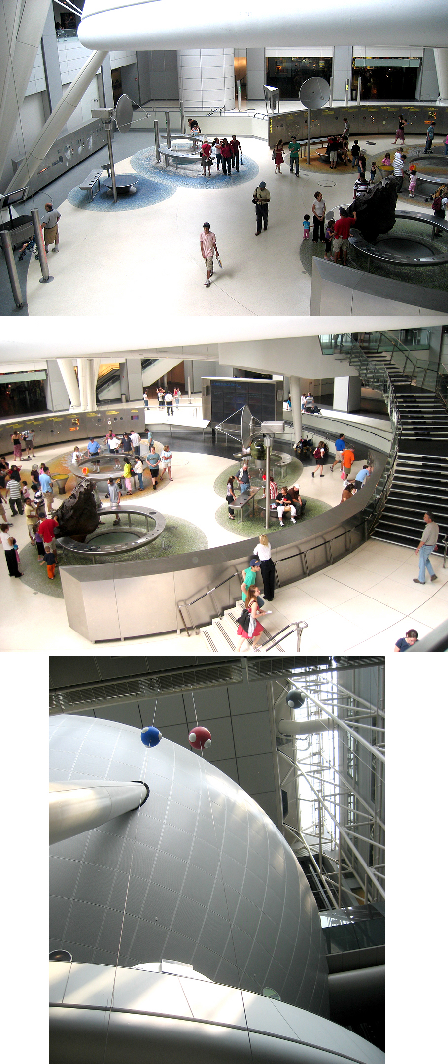 There are shows running in the sphere – currently Cosmic Collisions. Two major displays inside structured as walkways are designed to give you a sense of scale/magnitude of both time and size of things in the universe. One long spiral walkway covers a span of 13 billion years. This beautiful space is extremely visual and tactile. More photos…