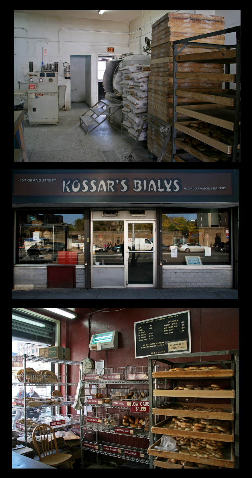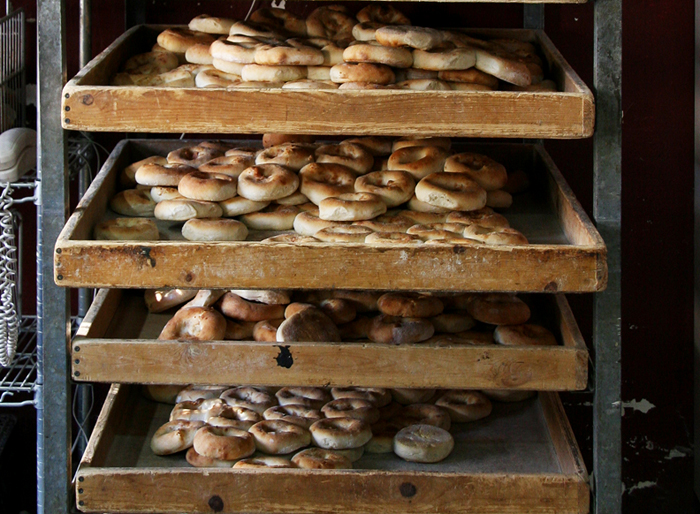 Kossar’s Bialys is the oldest bialy bakery in the USA. It was founded in 1936 by Isadore Mirsky and Morris Kossar and is located at 367 Grand Street in the Lower East Side. Everything is done right on the premises – the flour, ovens, and machinery are all in plain view – no pretense or nonsense here. See more photos here. Kossar’s also makes bagels, bulka, sesame sticks, and onion discs. See their website here.