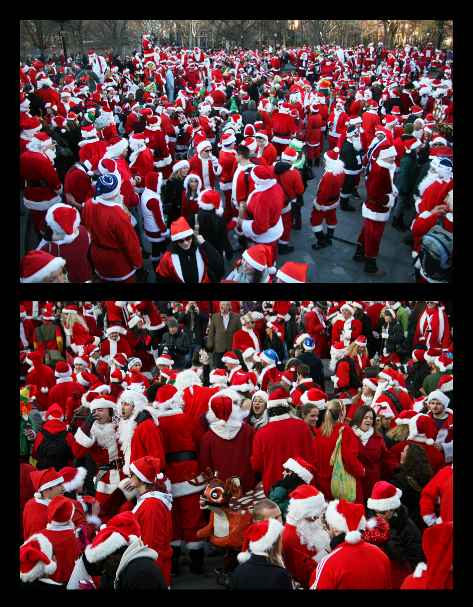 If you were in the city on Sunday, December 12, you may have run across groups of Santas roaming the streets. Washington Square Park was one of the stops on the convention, a flash mob of sorts which includes meandering the streets and spreading yuletime cheer. Creative costuming is encouraged, as well as gift giving.