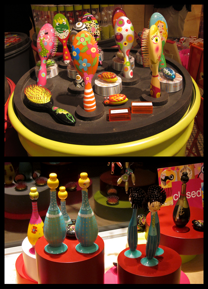About the Photo: Pylones is a gift shop featuring housewares, inspired by the elements of childhood – bright colors, bugs – with a strong cuteness factor. Here you will find an creative selection of items for the office, kitchen, beauty, decoration, jewelry, tools, and, of course, for children. Pylones is a small international chain founded in France in 1985 by Alan Ceppos and Frédéric Rambaud. There are 5 shops in the US (all in New York City), as well as locations in Brazil, Asia, and Europe. They also distribute their product to other shops. You can see their website here.