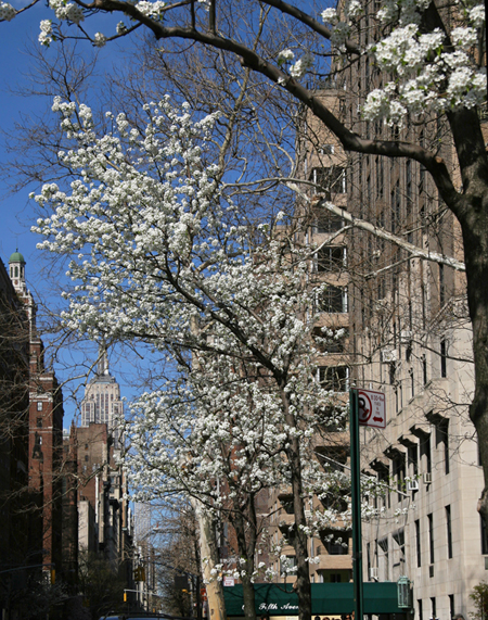 There are parks where nature reigns – Central Park, Prospect Park, Van Cortlandt, et. al. And there are neighborhoods and streets where nature shines. But, like most other living things in New York City, certain plants (and people) do much better than others. So, in aggregate, the city has its own brand of nature, often dominated with plants that are hardy survivors, such as the London Planetree, or the Callery Pear seen in today’s photo on lower Fifth Avenue in Greenwich Village looking north to the Empire State Building.