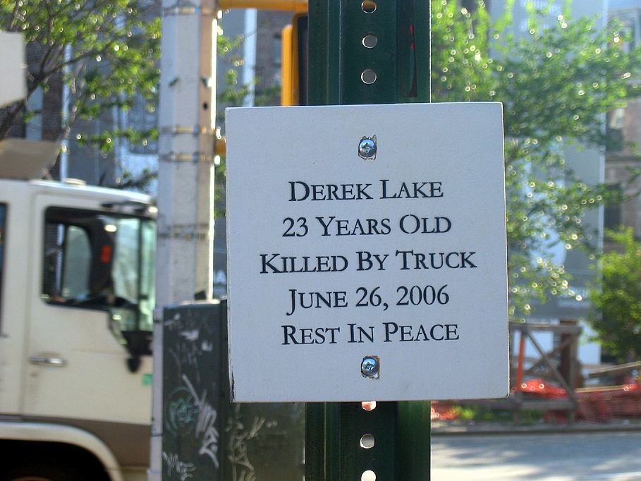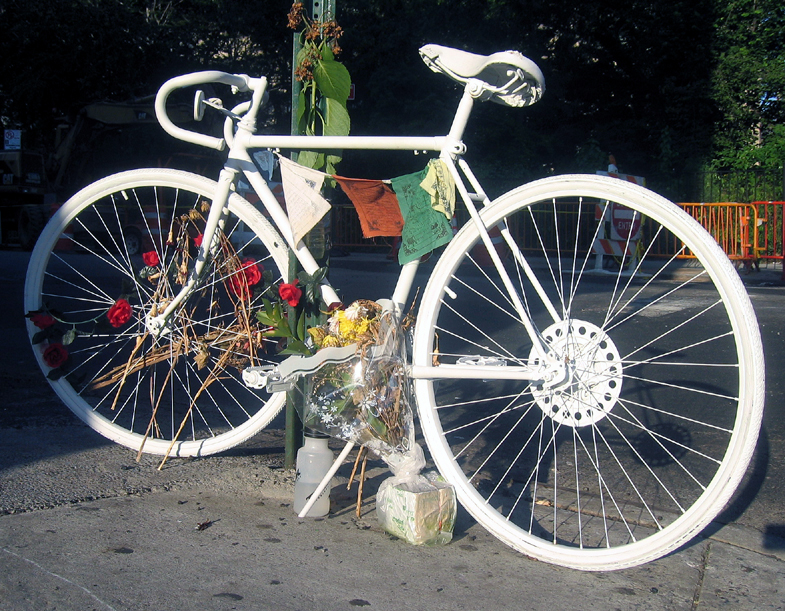 I appreciate your posing this part of life in NYC. There is a reason Critical Mass exists in so many cities. Here in Seattle last year a safety group secretly mounted white bicyles up on corners or up on street signs near where cyclists had been hit. They called themselves Ghost Cycles, and I saw them all over town. Each one just had a sign with a number on it, but represented a particular accident victim. Three years ago when we lived in the SF Bay Area, my husband commuted to work by BART train and bicycle. He was hit by a truck that turned into a driveway in front of him. When I reached the emergency room and saw him strapped to a back board I almost lost it with panic. Then he jokingly said to me with a wan smile, “I’m okay love, I landed on my head.” His helmet had broken in half, and he had bumps and bruses and severe whiplash-like symptoms, but amazingly no fractures. His bike didn’t make out as well. I’m so sorry for this young cyclist.