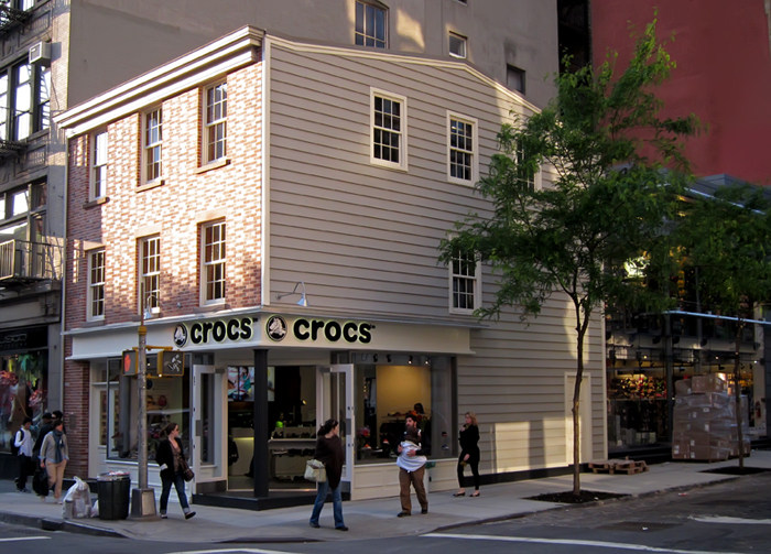 This store, like Crocs themselves, has and will continue to attract critics. The thing that has made this project particularly contentious is that this building at 143 Spring Street, previously the home of Tennessee Mountain Ribs restaurant, was in serious disrepair – work did need to be done. So the criticisms gravitate towards the architectural details of what has been done and, of course, the presence of Crocs in SoHo.