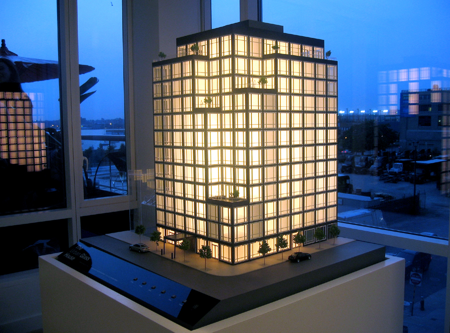 The photo is actually of a model of the building on display in one of the apartments for sale. Here is a photo of the building from the street. The residential building is modeled after one of architecture’s most iconic structures – his Glass House in New Canaan, CT.