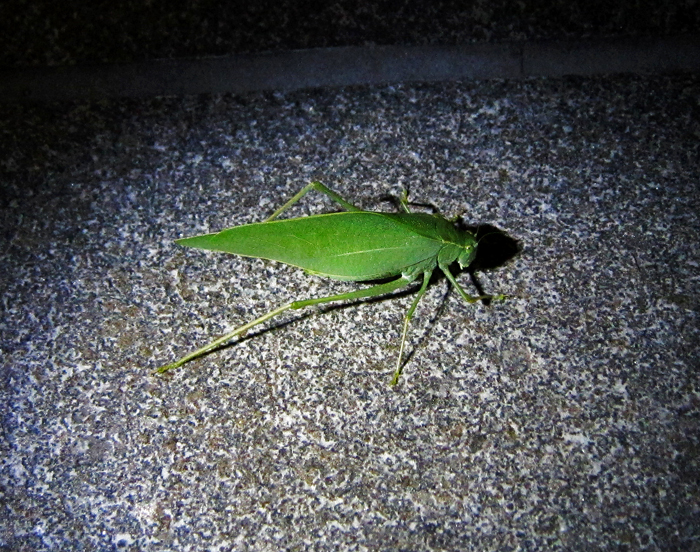 For a few moments with a katydid on granite, we saw, well-illuminated by spotlight, the ultimate juxtaposition when jungles collide 🙂