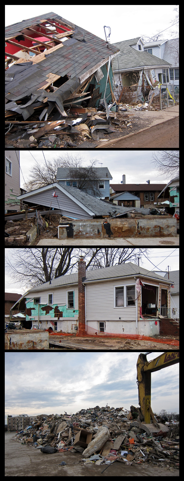 Yesterday, I drove through one of the worst hit areas on Staten Island, New Dorp Beach, which still looks and feels like a war zone. Police vehicles are everywhere, patrolling the neighborhood. Many homes remain unoccupied, with red, green, and yellow placards taped to their home by the Department of Buildings, identifying their occupancy status. Some homes appear to have been largely renovated while others still await repairs. And there are those which are beyond repair.