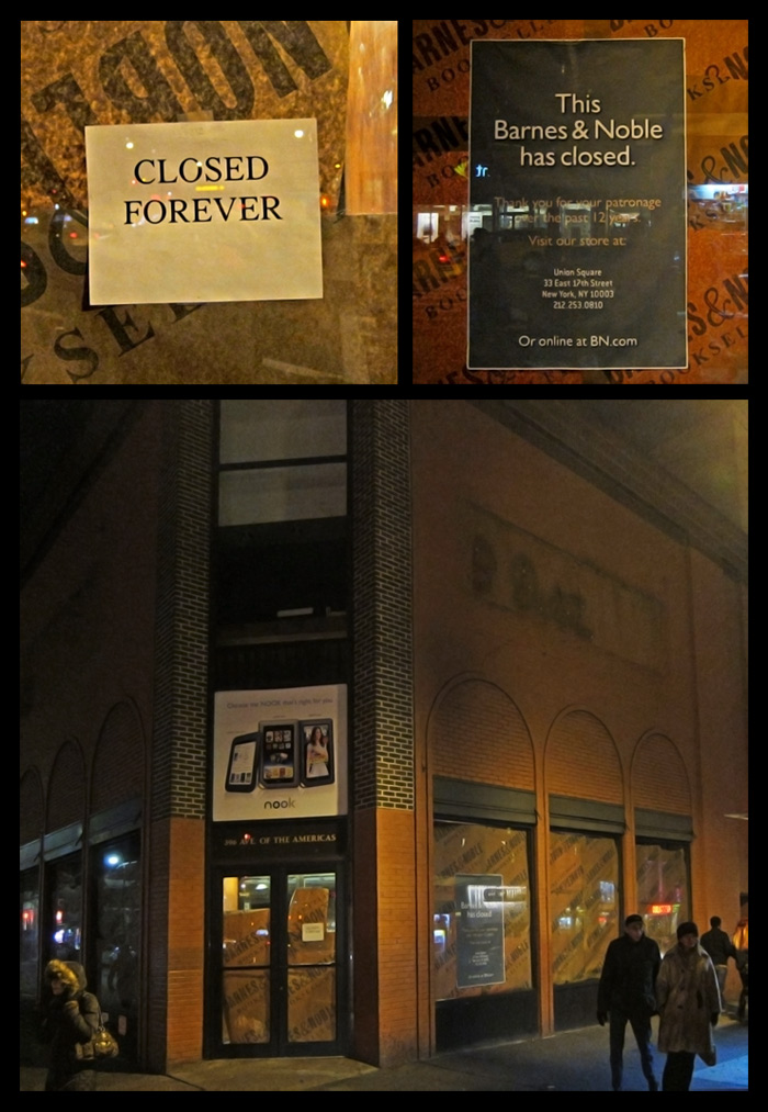 It had been announced that the Barnes and Noble at 8th Street and 6th Avenue would close. The store is an anchor for the block – it occupies the corner and the entire two-story structure. It has had numerous incarnations. In the 1960s-70s, it was a popular late night watering hole and home to Nathan’s and an Orange Julius. I paid little mind to the store closing announcement, as many things can be said and stays of execution are common in business. However, last night en route home, the death knell tolled again. The windows were papered and a sign on the door said it all. Closed Forever.
