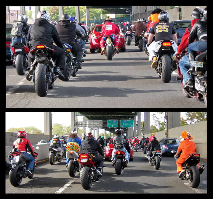 Even though your vantage point stayed the same with relation to the car in front of you, ALL THE BIKERS WERE DIFFERENT! It must have been ridiculous. I recognise that spot, exiting from the LIE to the BQE, and you haven't moved far at all.