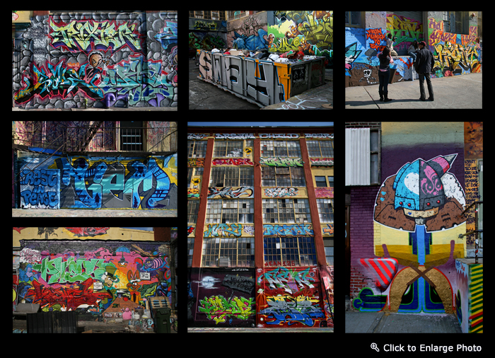 I was astounded by the work, brilliant color, and mammoth size. All the surfaces of the block long, 200,000-square-foot (19,000 m2) factory building complex, are covered. The building itself is owned by Long Island real estate developer Gerald Wolkoff, who sanctions the work.