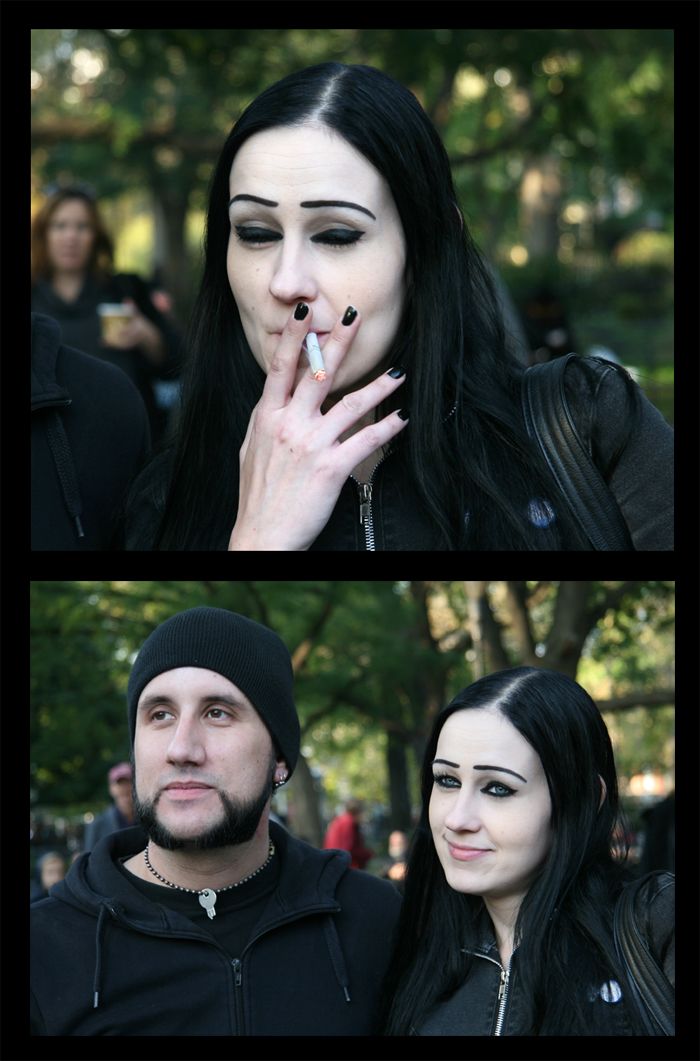 I was at a concert October 23rd in Tompkins Square Park featuring a number of bands, including David Peel. Scanning the sparse crowd, the photo subject du jour was immediately obvious – a Goth Girl accompanied by a Man in Black.