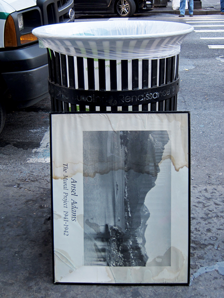 The conversation with the photography student prompted me to notice the framed poster in today’s photo, placed prominently near a garbage can on Broadway in NoHo. Apparently the owner had heard of Ansel Adams, and disposing of this poster was due to the apparent water damage and not any “kind of” statement about Adams 🙂