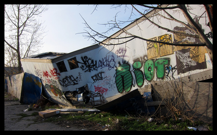 As I approached the end of the short block, I was welcomed by a wrecked tractor trailer, folded in half and now being used as a canvas for graffiti.