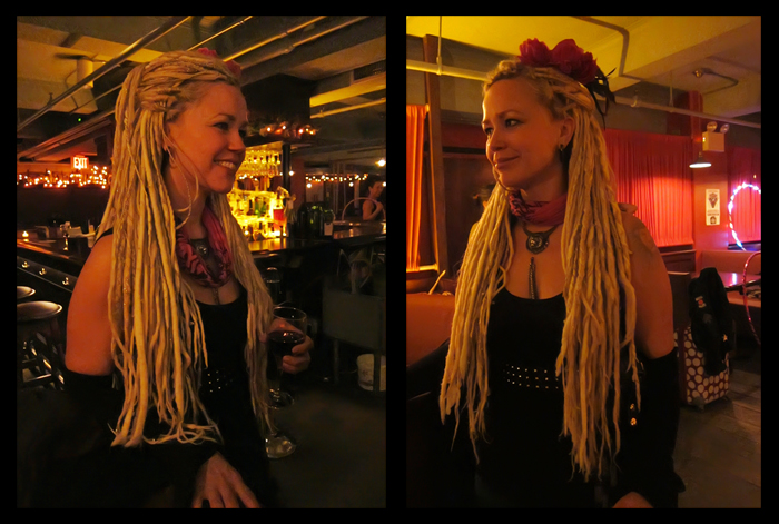 “I have yarn and synthetic hair extensions, installed by Dana Devine, The Goddess Maker. The yarn that comprises my hair is a combination of wool, mohair, roving (equivalent to the same lambs’ wool I once lined my point shoes with!) acrylic gold (which makes it sparkle), and a silk yarn that’s made from sari’s from India. The extensions were installed on Friday 8/13, the day before my birthday and massive boat party, and 2 weeks before my departure to Burning Man. Dana was at my house for 12 hours, though I believe we actually worked for about 8-9 hours. We took many breaks, as it’s pretty intense work for a long haul.”