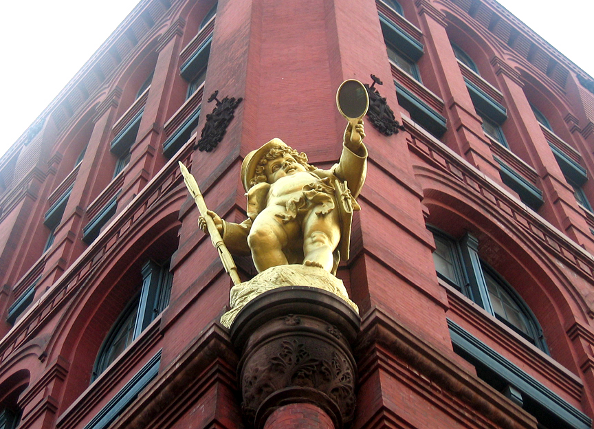 There are two gilded figures of Shakespeare’s Puck, one shown above and one above the entrance. It is a magnificent and spectacular building with double rows of arched windows and vast interior sunlit spaces (see more photos here). The building has both office space and ballrooms used for public events – there is a Skylight Ballroom on the top floor and the Grand Ballroom on the ground floor (10,000 square feet with 20 foot ceilings.) The building has housed numerous tenants, including Spy Magazine, Pratt Institute, and NYU’s Wagner Center, currently its largest occupant. Click here for an excellent history and other info…
