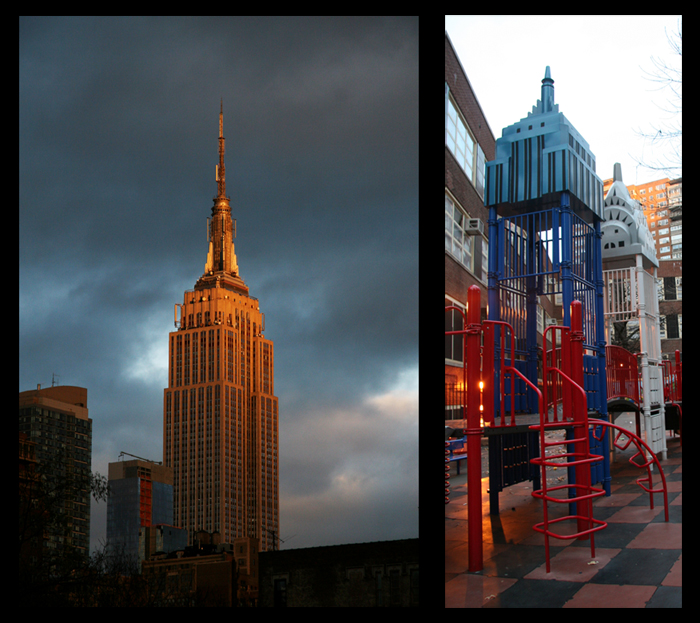 After a time, any resident or visitor to the city can become inured to the vistas and architecture of New York. However, along with the people, the structures of the city define our metropolis. Interest in architecture itself is often eclipsed by the dynamism of New York’s many other attractions – restaurants, shops, clubs, bars, theater, parks, festivals, and street life. So, it was very uplifting to see this school playground in Chelse,a where models of the Chrysler and Empire State buildings are connected by bridges, decks, ladders, and slides and serve as part of the school’s outdoor recreation area.