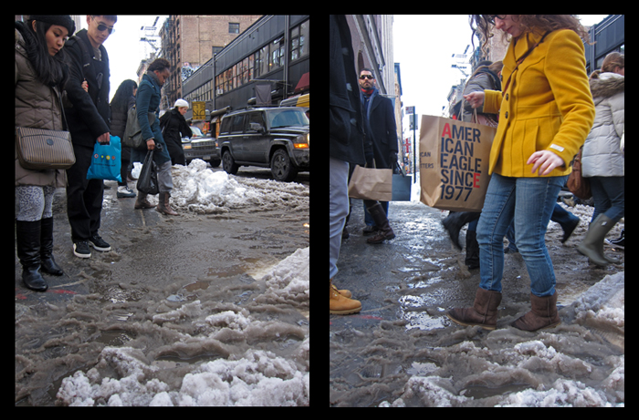 However, extensive walking is the norm here, and sidewalks are largely navigable without waterproof shoes, so for many, lugging a pair of shoes to change into or the prospect of wearing boots all day at the office are all unappealing. So, many tread the streets with footwear that really is inadequate for a world of slush.