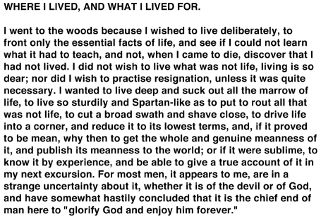 I carry two quotes with me in my wallet from Walden by Thoreau. One is quite well known and often cited – a portion was in fact used in the film Dead Poet Society (see it here). The other, concerning the nature of business, seems so often applicable to my daily life as to lead me to be frequently disturbed: