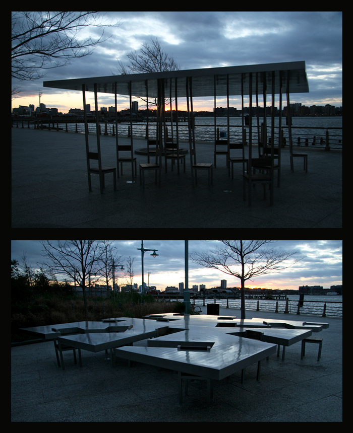 Photo Note: Two Too Large Tables are located at Hudson River Park. The two works, designed by Allan and Ellen Wexler, were constructed from stainless steel and ipe wood and fabricated by Polich Art Works. One is comprised of 13 chairs, 7 feet tall, supporting a 16-foot-square plane. The other, also 16-feet-square, is 30 inches tall with integral seating areas. One serves as a shade pavilion and the other a community table.