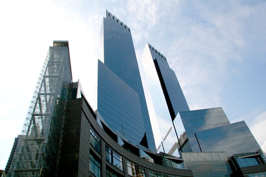 This recently completed development, with its 750-foot towers, resides at Columbus Circle, an area which has posed design difficulties. It is an intersection for Central Park West and South, Eighth Avenue, and Broadway. It is the site of the former New York Coliseum building, a very unattractive structure built in 1954 and finally demolished in 2000. Click here for a photo history of the area.