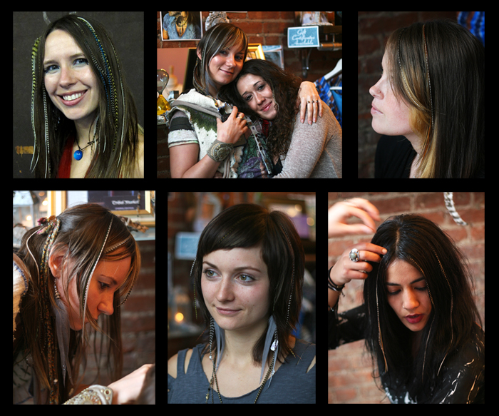 My eye was drawn to a small group where hair was being examined. I made the acquaintance of Allison Kocar (upper left photo) who, it turns out, was a customer and had been to my showroom but I had never personally met. She was engaged in conversation about her hair extensions which I found extremely striking. I learned that these were rooster feathers, dyed various colors.
