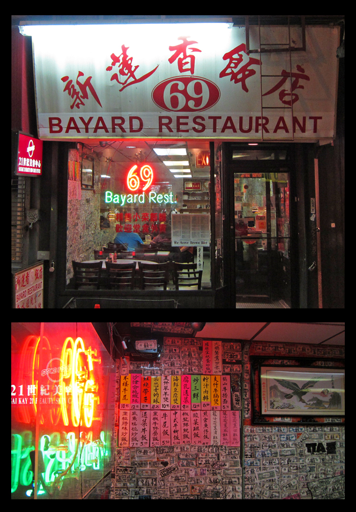 At 69 Bayard Street in Chinatown, we have the 69 Bayard Restaurant. This establishment has been in operation for eons and is most well known for its walls which are completely covered in one dollar bills, signed by patrons. Like Wo Hop at 17 Mott Street, 69 Bayard is open 24 hours a day – one of those things so many love about New York City and hard to find elsewhere. Like Kiev or Veselka in the East Village, 69 Bayard is often frequented by late night bar (or club) goers who want to eat after bar closings (4 AM).