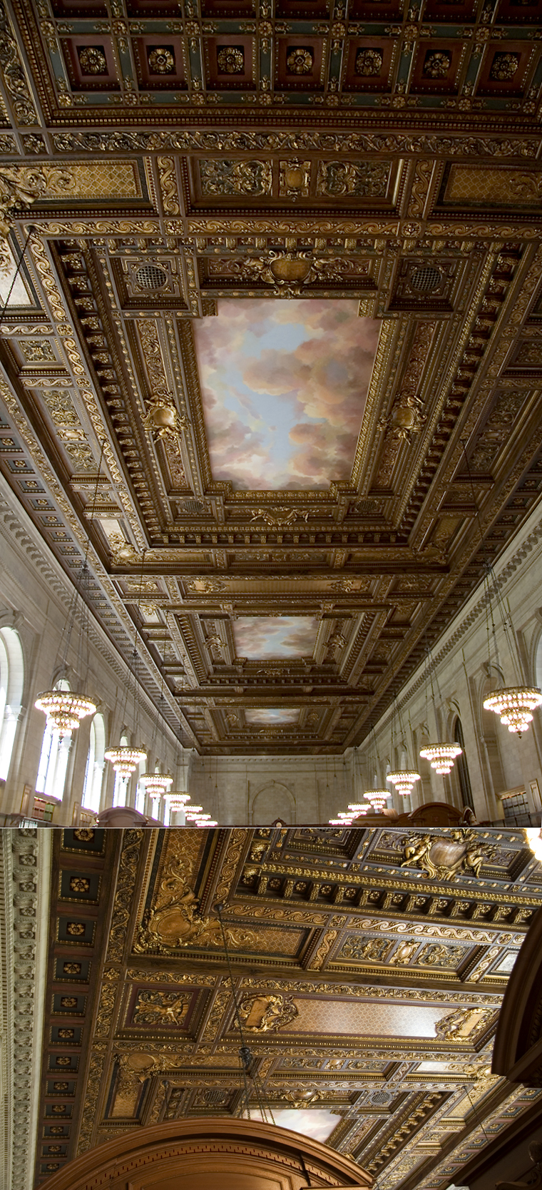 The room is nearly two city blocks long (297 feet), 78 feet wide, and 51 feet high (note: this photo only shows one half of the room). It seats 636 people at its long oak tables with original bronze lamps and chandeliers. Here you can access 6 million books, 12 million manuscripts, and 2.8 million photos beneath magnificent ceilings with murals of blue sky and puffy clouds, inspired by Tiepolo and Tintoretto. See more photos here. This room is a must see for visitors and residents alike…