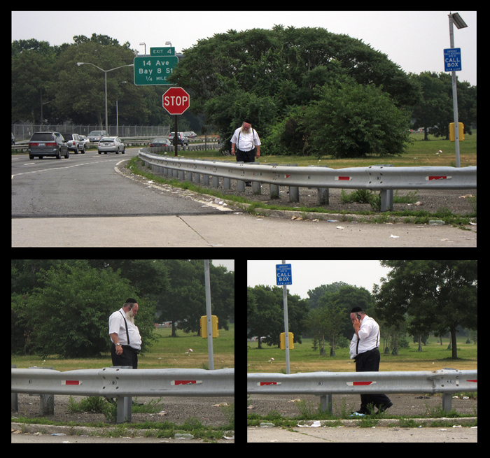 Upon leaving, I was struck by the appearance of a Hasidic Jew on the roadside combing the area. This type of stark contrast of orthodox religious clothing, particularly on a summer day, though not uncommon, is always startling. On the hottest of Saturdays in Borough Park, Brooklyn, orthodox Jews can be seen strolling fully clothed in black pants, long sleeved shirts, and wool hats.