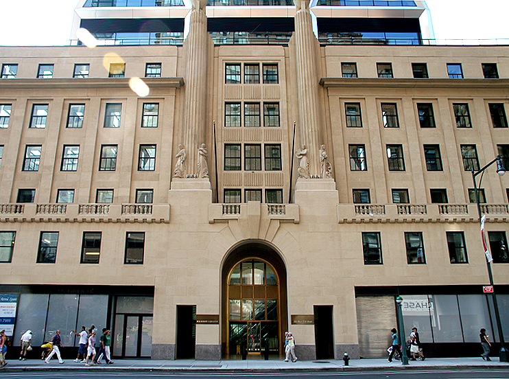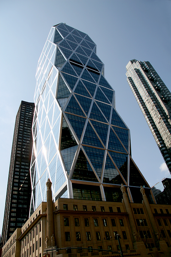 The Hearst Tower (at Eighth Avenue and 57th Street) is world headquarters for the Hearst Corporation, a media conglomerate – they own newspapers, magazines and television networks. Architecturally, this building is notable for a number of reasons – the most obvious is its triangulated glass and faceted corners (or diagrid). The building was originally designed in 1927 as a six-story Art Deco structure (the Hearst Magazine Building) with limestone facade to house the magazines that William Randolph Hearst owned at the time. There were plans to add a tower, however, this did not come to fruition until May 2006, when the 42-story tower (designed by renowned architect Norman Foster) was added to the original limestone base.