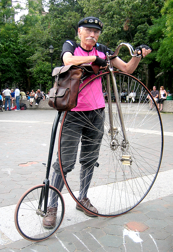 It’s always a rare pleasure to see one of these beautiful, elegant cycles. Penny Farthing is the British term for this early style of bicycle – the term derives from two coins of the time: the penny (large) and farthing (small). This bicycle has also gone by the names Ordinary and High Wheeler. There was no gearing on these bikes – the pedals were attached directly to the axle, essentially making this like a large unicycle. To get greater speeds, the wheel size was made quite large. This design was quite treacherous – the rider sat high (and over the center hub), and any sudden stops sent him/her flying. Mounting was quite tricky – see Gary Anderson (in the photo) demonstrate mounting and riding in my video: