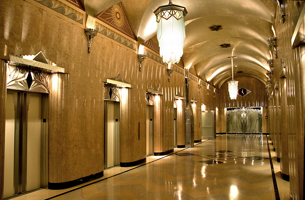 This is the lobby of 570 Lexington Avenue, originally the RCA Building and later the GE building, one of the world’s finest Art Deco masterpieces. This small but exquisite and elegant lobby is one of my favorites in NYC – vaulted silver and terracotta ceilings, terrazzo floors, polished marble walls with mosaic wave frieze, reliefs of swords and electric bolts, lamps with aquamarine glass, and ornate nickel silver sconces. I love the elevators with the motifs above each – I understand that the elevator cabs inside are rosewood-paneled.