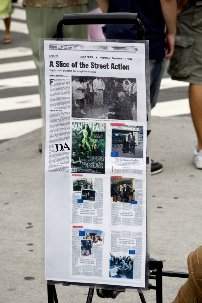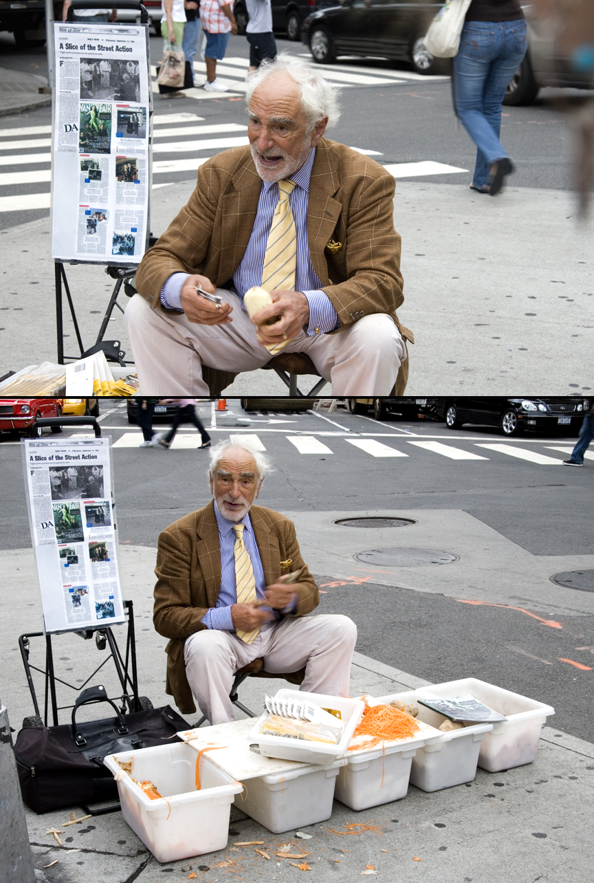 I have observed this vegetable peeler salesman for years at Union Square – he is nearly always surrounded by a crowd (see more photos here). Joe Ades, 72, is a remarkable pitchman; people watch just to see his impassioned sales style, selling his peelers at $5 a clip (which he claims are from Switzerland and unavailable elsewhere – see here). A terrific in-depth article was done by Vanity Fair in the May 2006 issue titled The Gentleman Grafter. You can read the story here.