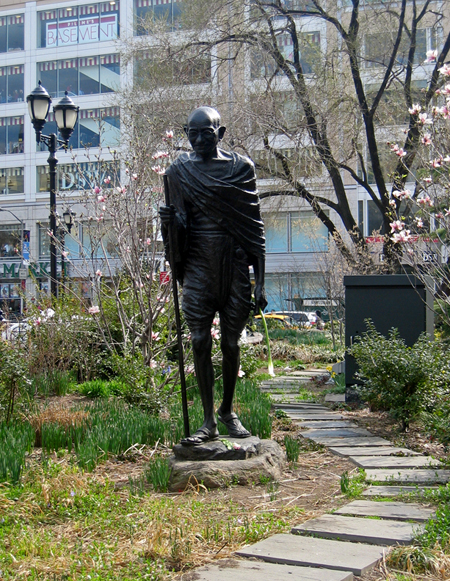 It was appropriate on this magnificent spring day that someone had placed a flower in Gandhi’s left hand. This bronze of Mohandas Gandhi by Kantilal B. Patel was installed on a traffic island on the southwest corner of Union Square Park in 1986, one year after a major renovation of the park. I have always been moved by Gandhi, and this statue always brings his life to mind. A reminder of his calm and resolve in the face of adversity is perfect for one of the busiest areas in New York City. Visit this small sanctuary should you get a chance…