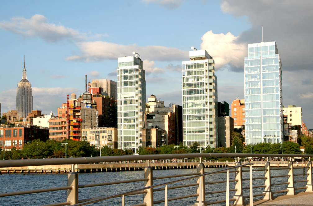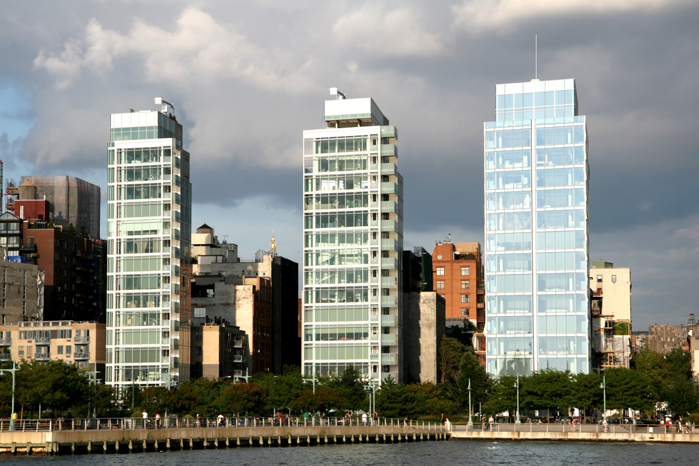 In the far West Village, flanking the Hudson River and the new, immensely popular Hudson River Park (this photo was taken from the Christopher Street Pier) are three residential 16-story towers all designed by starchitect Richard Meier. The projects all share a crystalline structure, clad in insulating laminated glass. Click here for additional photo.