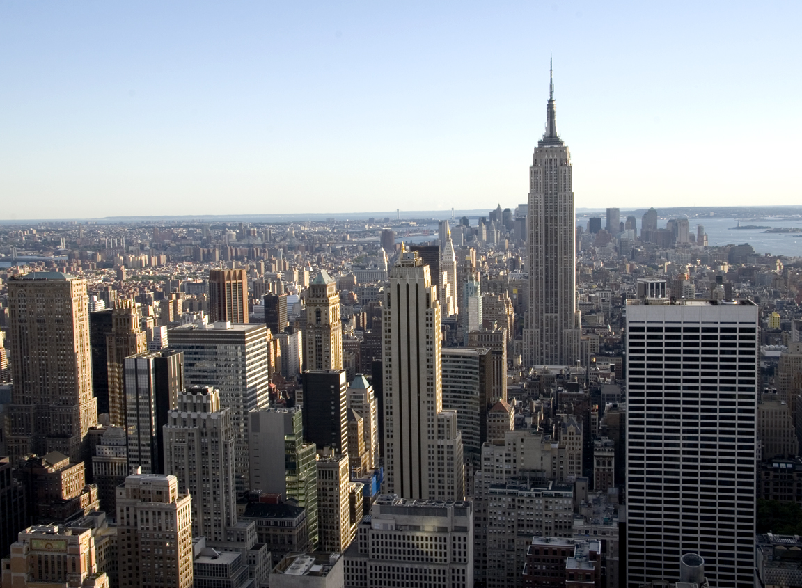 This photo was taken looking south from the Top of the Rock observatory at Rockefeller Center. This view is of particular interest for a number of reasons. Dominant in the photo is, of course, the Empire State Building, currently NYC’s tallest building, built in 1931 and billed as the Eighth Wonder of the World when it opened. If you look carefully, at center left, you can see the Brooklyn Bridge, and behind it is the Verrazano Bridge; at center right, you can see the Statue of Liberty and Ellis Island. The land masses from left to right are Brooklyn, Staten Island, and New Jersey. The slab skyscraper on lower right is the WR Grace building.