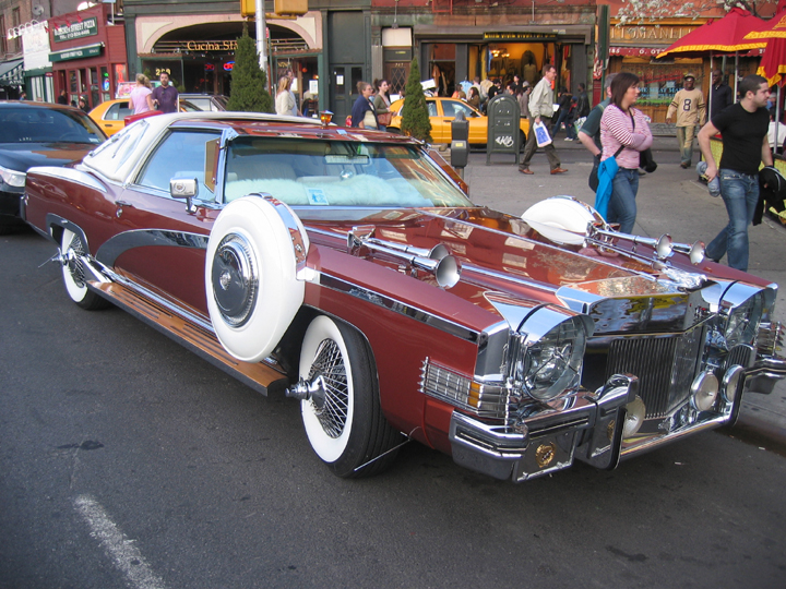 The great weather today brought crowds of people out to the streets, and everyone was showing off what they had, especially the owner of this customized Cadillac parked in front of a Mexican restaurant (with its themed taxicab) in the West Village. Many stopped, looked, and took photos, but no one seemed to know who the owner was or anything about it. No luxury was spared. When something so garish is executed with such care, it sometimes achieves a certain beauty. Note the fur-covered dashboard!