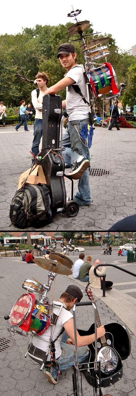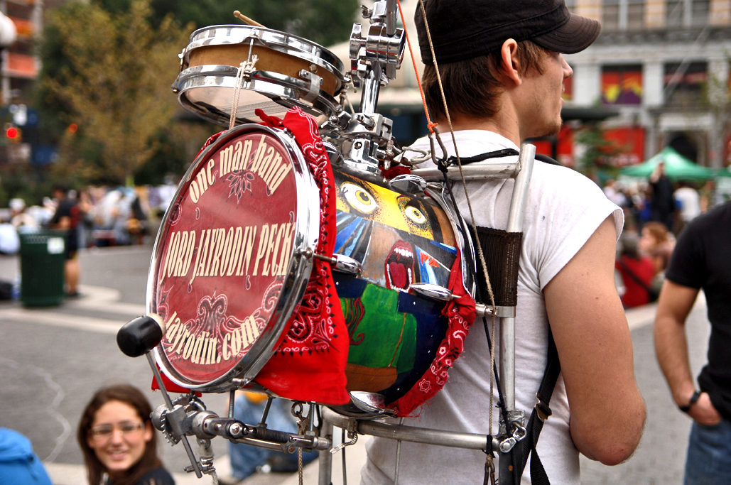 Jord Jayrodin Peck is an itinerant one-man band. I was fortunate to meet him twice, the first time at night (with no camera). This photo was taken in Union Square, where he was discussing his run-ins with the law. Click here for more photos. He was prevented from playing, having been told that his drums were amplified instruments (?). It’s sad in the city to see people like this ticketed while drug dealers sell their wares with impunity because they know how to work the system.