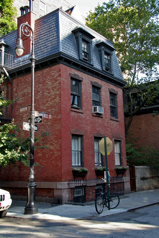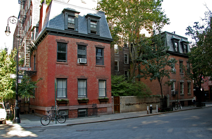 On one of the most picturesque corners in the city, where Commerce Street meets Barrow Street, are a matching pair of buildings: 39 and 41 Commerce Street. Click here for 2nd photo. Folklore has it that these two buildings were built by a sea captain for his two feuding daughters. In fact, they were built in 1832 as an investment by Peter Huyler, a milkman from Hackensack, New Jersey. A full third story under mansard roofs were added in 1873. What’s unusual is that this pair of buildings shares a very large garden (the entrance doorways are through the garden). One must remember, however, that at the time these were built, Greenwich Village was still a suburb of the city and that most of the houses in the area had small adjacent plots – land did not have quite the premium that it has today.