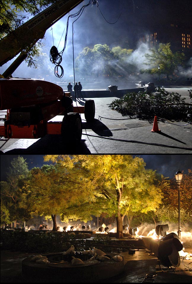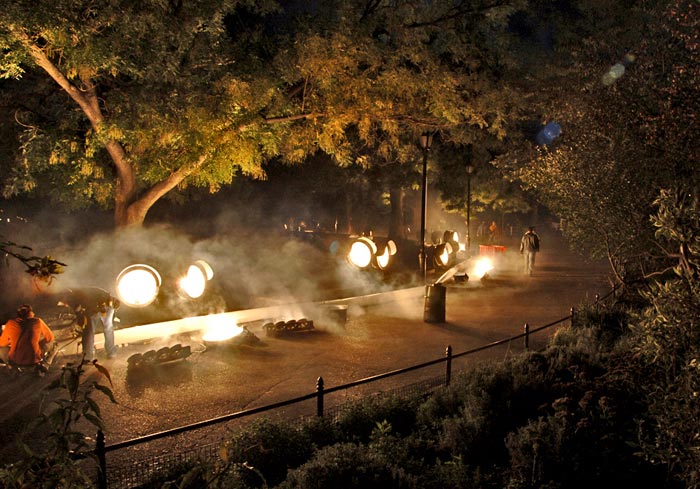 No, this is not a war zone. For two weeks, there has been nightly filming in Washington Square Park of the 2007 film I Am Legend, starring Will Smith. You can read about the cast, synopsis, etc., here. This is the biggest production I have ever scene – 12-hour film days from 6PM to 6AM with cranes, stadium lighting, large felled trees, lit helium balloons to simulate moonlight, and, last night, the most impressive fog/lighting display. Click here for more photos.